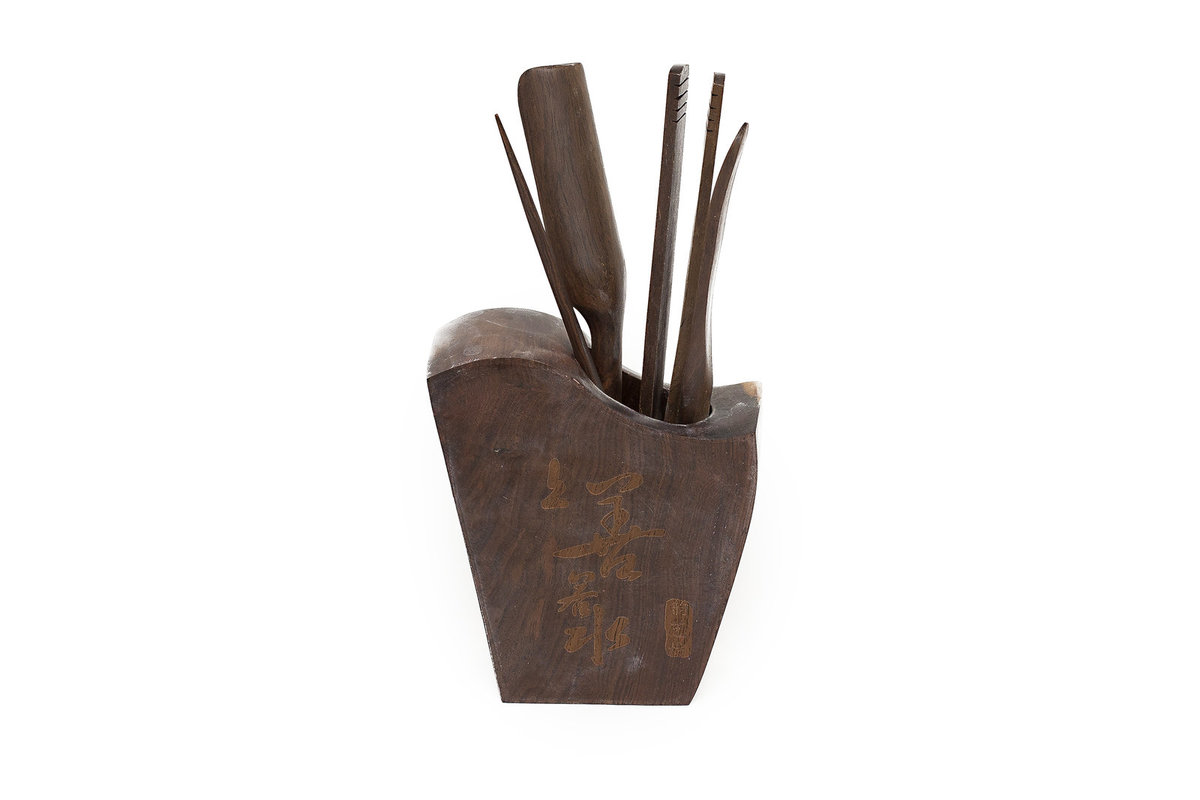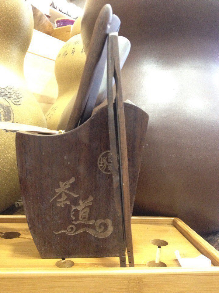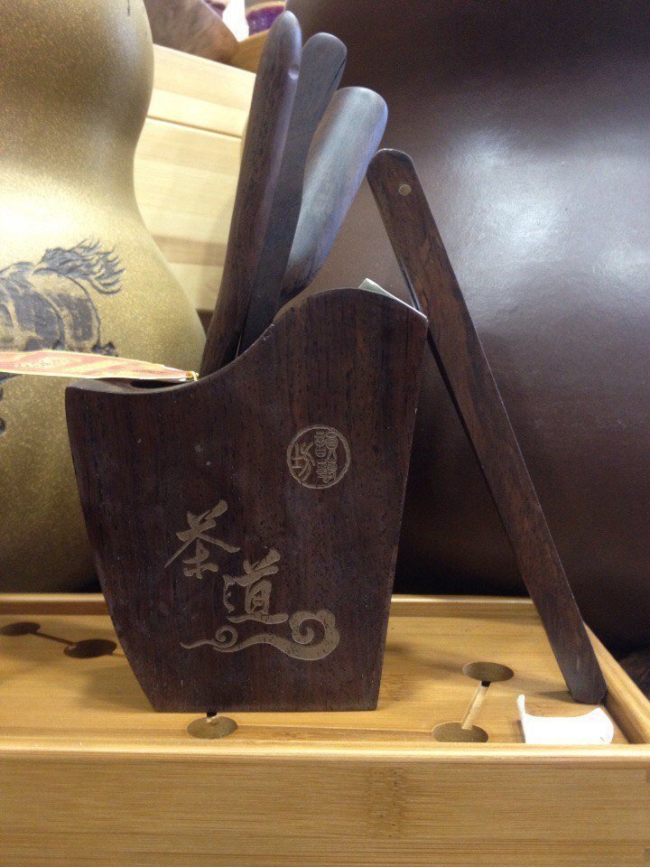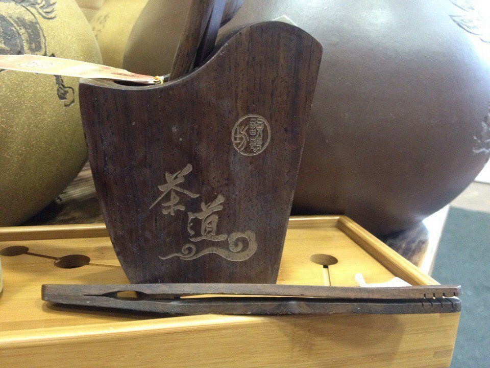 Роскошный набор чайных инструментов в подставке из цельного спила дерева. В комплекте: щипцы, лопатка для чая, совочек для чая, игла для чайника. Дефект: немного искривились щипцы. К набору легко можно подобрать другие.